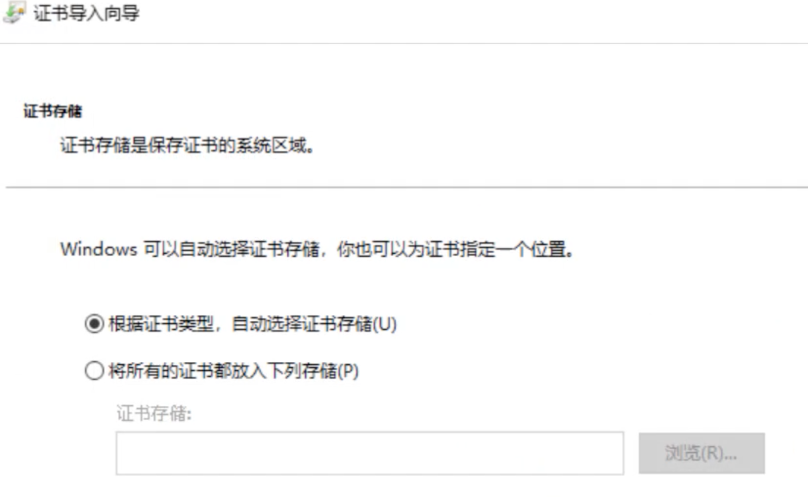 windows:同上。在随后的证书对话框中进入证书安装向导,到达下图中证书存储时,通过自定位存储位置(浏览按钮),存储到 “受信任的根证书颁发机构”