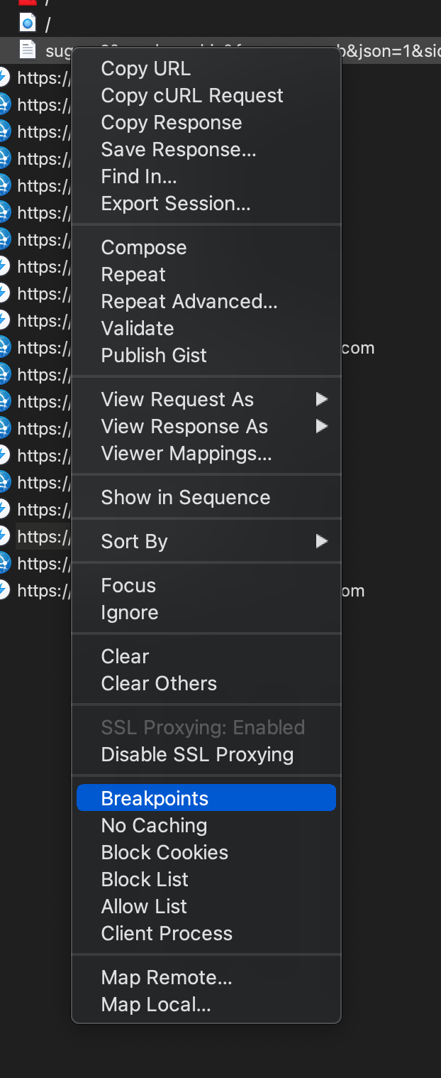 启用断点功能 Menu Bar -> Proxy -> Enable Breakpoints 或 工具栏中的断点按钮